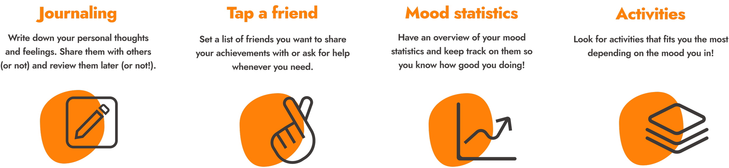 Users can share their feelings with people who might be going through the same as them, reach for help in whatever level they feel comfortable, track their ups and downs, and identify triggers in their mood and behaviour through the assistance of tests and tips.